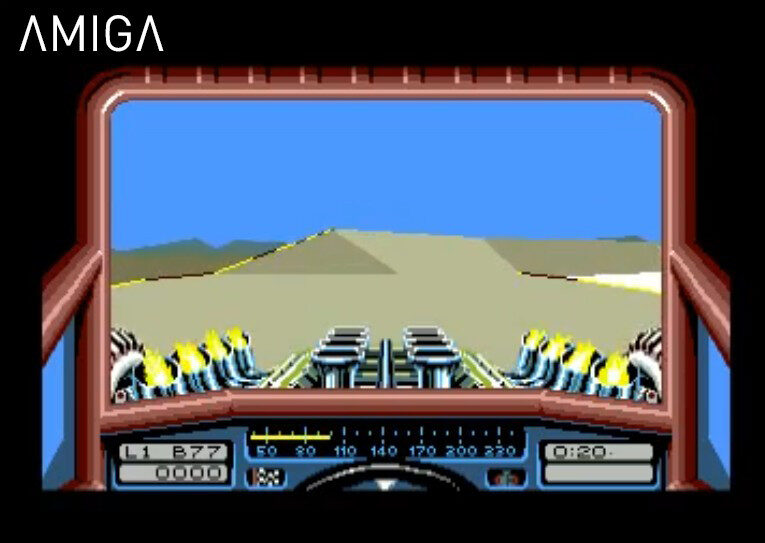 Die Amiga-Version gilt als die Urfassung, auch wenn es parallel Umsetzungen für C64, Atari ST, MS-DOS und sogar Amstrad gab. Aber auf dem Amiga war das Spiel ein technisches Kunststück. Vollbild-3D-Grafik, butterweiches Scrolling und ein Fahrzeug, das sich nicht einfach nur über die Strecke schob, sondern wog, federte, stürzte und bei harten Landungen öffentlich seinen Rahmen riss. Ja, Stunt Car Racer hatte sichtbaren strukturellen Schaden. Wenn der Rahmen zu viele Risse hatte, ging das Rennen zu Ende. Realismus auf die harte Tour.