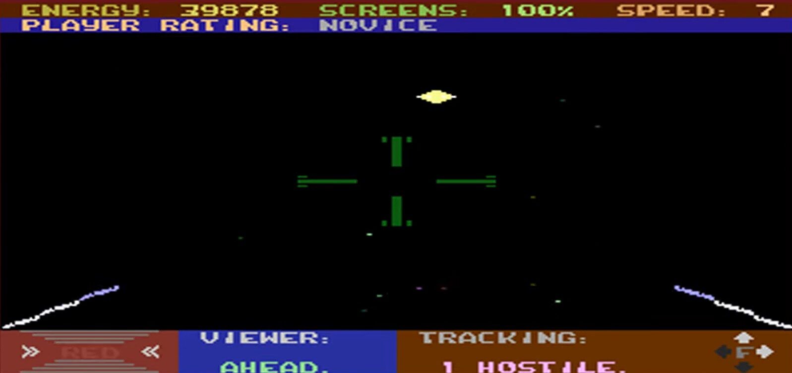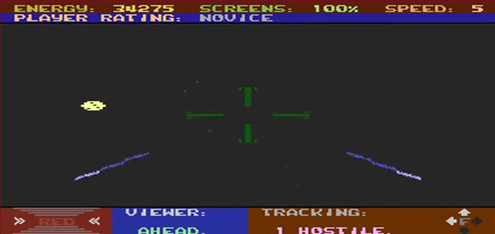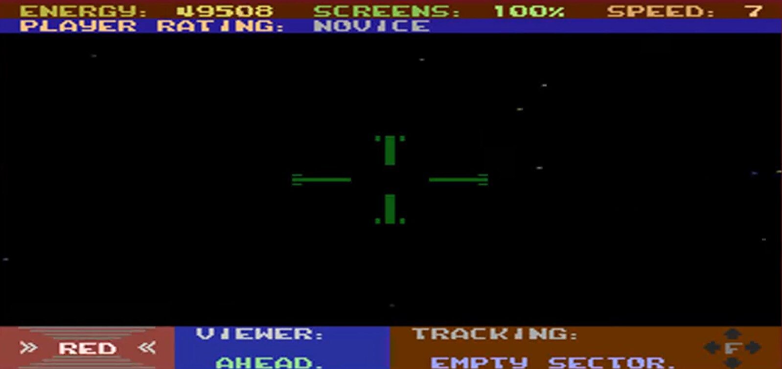 Auf dem Bildschirm sieht man oben und unten die Instrumententafel mit Energieanzeige, Schildstatus, Geschwindigkeit, Sektor‑Raster und Feindmeldungen; zur Steuerung nutzt man die Zifferntasten 0–9 für Geschwindigkeit, den Joystick für Zielerfassung und Tasten F1–F3 für unterschiedliche Schutzschildstufen – ein ausgeklügeltes System, um die knappe Hardware zu bändigen.
