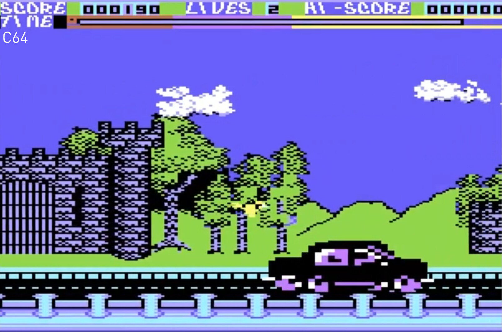 Die Commodore-64-Version stammte aus der Feder des damals 18-jährigen Tony Crowther, der schon als Wunderkind der Szene galt. Crowther programmierte rasend schnell, und er selbst erzählte später, dass er zuerst einfach ein sauberes Side-Scrolling basteln wollte, und erst danach die Idee mit der Taube kam. Percy flattert über eine bunte Landschaft, sammelt Zweige für den Nestbau und muss sich dabei mit Straßenverkehr, Katzen, Ratten und feindlichen Vögeln herumplagen. Seine einzige Waffe ist der eigene Verdauungstrakt: Eierbomben, die Autos ins Schleudern bringen oder Katzen verjagen können. Dass man beim Tod von Chopins Trauermarsch verabschiedet wird, ist so typisch britischer Humor, dass man sich heute noch amüsieren kann. Und wenn beim Startbildschirm das bekannte BBC-Thema aus „All Creatures Great and Small“ ertönt, erkennt man sofort Crowthers Gespür für ironische Brüche.