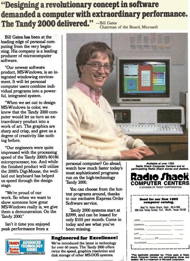 Letztlich ließ Radio Shack den Tandy 2000 schnell fallen und bot kaum noch Unterstützung. Nicht verkaufte Geräte wurden später zu Terminals für die eigenen Filialen umfunktioniert – ein ironischer Schlusspunkt, da bereits der ursprüngliche TRS-80 Modell 1 als Terminal-Ersatz geplant war.
