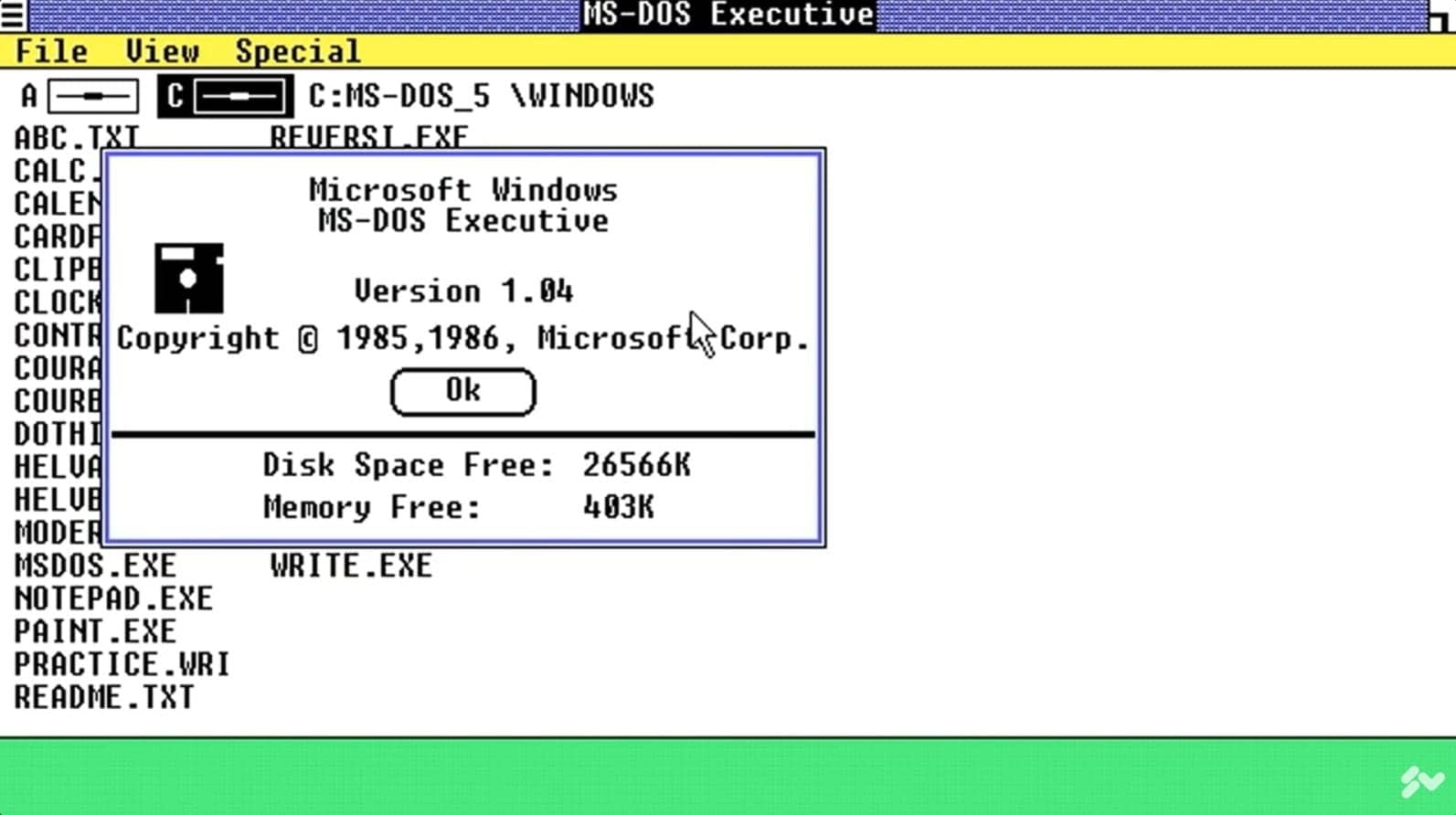 Windows 1.0, das erste grafische Betriebssystem von Microsoft, wurde am 20. November 1985 veröffentlicht. Die Entwicklung begann bereits 1981 unter dem Codenamen "Interface Manager". Bill Gates kündigte das Projekt am 10. November 1983 in New York offiziell an und prognostizierte, dass es bis Ende 1984 auf über 90 Prozent aller MS-DOS-Rechner laufen würde. Die tatsächliche Veröffentlichung verzögerte sich jedoch um zwei Jahre. Das Entwicklungsteam bestand aus 24 Programmierern, die insgesamt 110.000 Stunden in das Projekt investierten. Tandy Trower, einer der Entwickler, schrieb die Spezifikationen für mehrere Desktop-Applets, darunter Paint, Windows Write, Calculator und Notepad. Er definierte auch die Systemsteuerung, um Systemeinstellungen anzupassen.