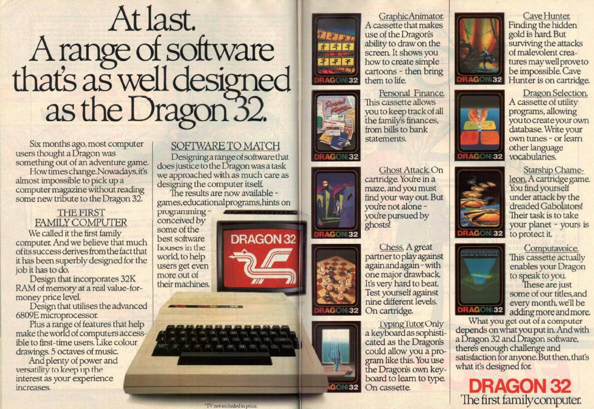 Der Dragon 32 war ein Heimcomputer, der im August 1982 von der walisischen Firma Dragon Data Ltd. auf den Markt gebracht wurde und seine Verwandtschaft mit dem TRS-80 Color Computer nie verleugnen konnte. Hergestellt wurde der Dragon 32, wie viele Computer aus diesen Tagen, in England, in diesem Fall von Dragon Data Ltd. in Port Talbot, Wales, sofern er für den europäischen Markt bestimmt war. Die amerikanische Version hingegen wurde von Tano in New Orleans, Louisiana produziert. Schon zu Beginn der achtziger Jahre entwickelte sich im britischen Heimatland ein regelrechter Computerboom, der auch Dragon Data dazu bewegte, ein eigenes Modell auf den Markt zu bringen. Befürchtungen, dass dieser auf dem Markt untergehen könnte, bestanden kaum, denn regelrecht jeden Monat entstand ein neuer Computer, der von den Käufern auch dankbar angenommen wurde. Im August 1982 stieg nun auch Dragon Data mit dem Modell Dragon 32 in diesen Markt ein und wurde recht schnell ein Erfolg, bedingt auch durch die großartige Unterstützung von unabhängigen Softwareentwicklern, hier besonders Microdeal. Der Markt schien groß genug, dass auch ein eigenes Magazin namens Dragon User monatlich erschien. Wie zu dieser Zeit üblich, verkaufte sich ein Computer meist durch die Programme, in jenen Tagen besonders durch die Spiele, und hier hatte der Dragon 32 eindeutig Defizite: Seine grafischen Kapazitäten konnten sich nicht mit denen des Sinclair ZX Spectrum oder des Commodore 64 messen.