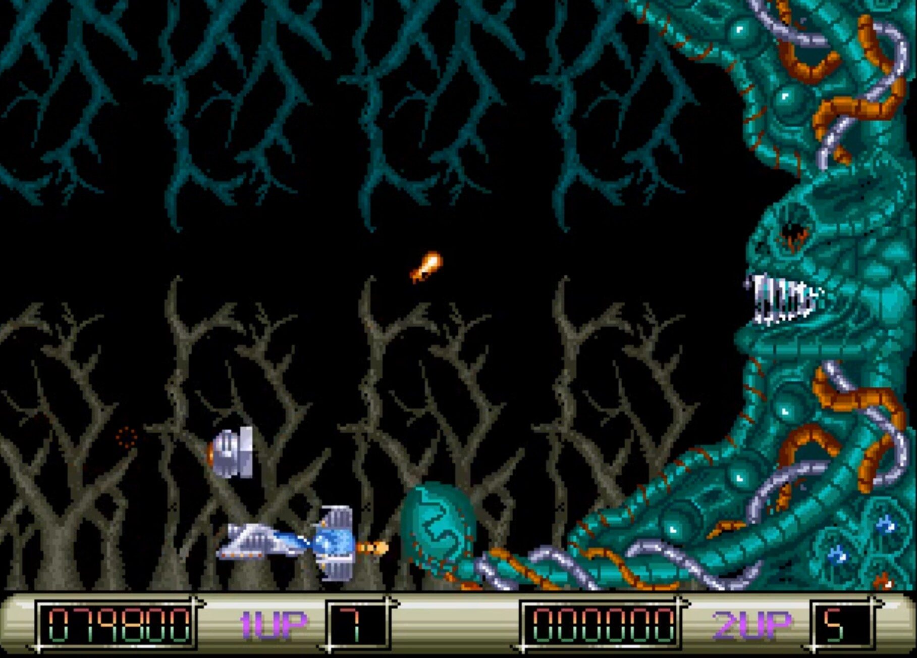 Das Spiel bietet sechs seitlich scrollende Level, prall gefüllt mit Gegnern, Power-Ups und Endbossen, die den Spieler schon nach wenigen Sekunden in Dauerstress versetzen. Anders als sein Vorgänger X-Out, der durch ein Shop-System auffiel, setzt Z-Out ganz auf klassische Action: Man fliegt, sammelt Power-Ups, rüstet sich mit Zusatzkanonen und Drohnen auf und versucht, im Dauerfeuer die Wellen aus organischen Aliens und mechanischen Monstrositäten zu überstehen. Der Clou und für viele das Highlight: Es gibt einen simultanen Zwei-Spieler-Modus, was Anfang der 90er im Genre der Amiga-Shooter eine Seltenheit war. Zwei Raumschiffe über den Bildschirm zu steuern, sorgte für lautstarke Wohnzimmerabende – auch wenn der Streit um die knappen Power-Ups nicht selten mehr Schaden anrichtete als die Alienflotte selbst.